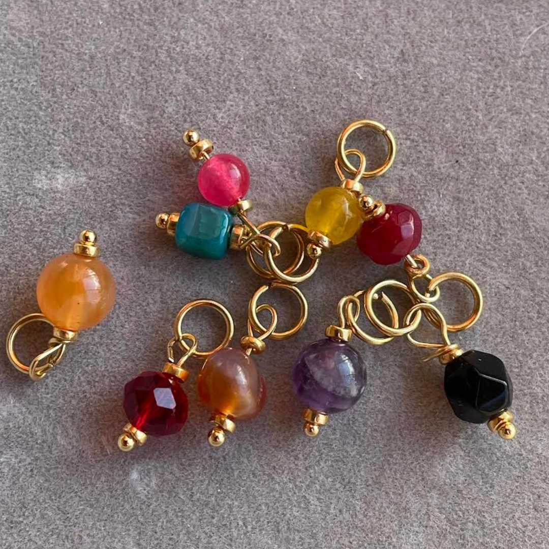 Hold styr på masker og dit mønster med Eliza Copenhagen maskemarkører til strik. Vælg mellem farverige (mange med fine ædelsten) og elegante maskemarkører, eller blot de helt enkle med Shell perler. Har du specielle ønsker, så spørg endelig.